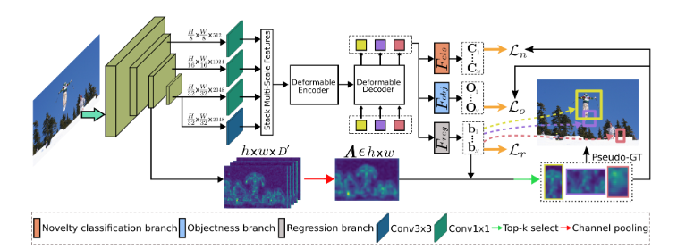 - 引入一个注意力驱动的伪标记方案,将注意力得分高,但不匹配任何已知类别的预测框标记为未知类别。利用伪未知样本和ground truth已知样本训练一个分类器,区分未知对象和已知对象。