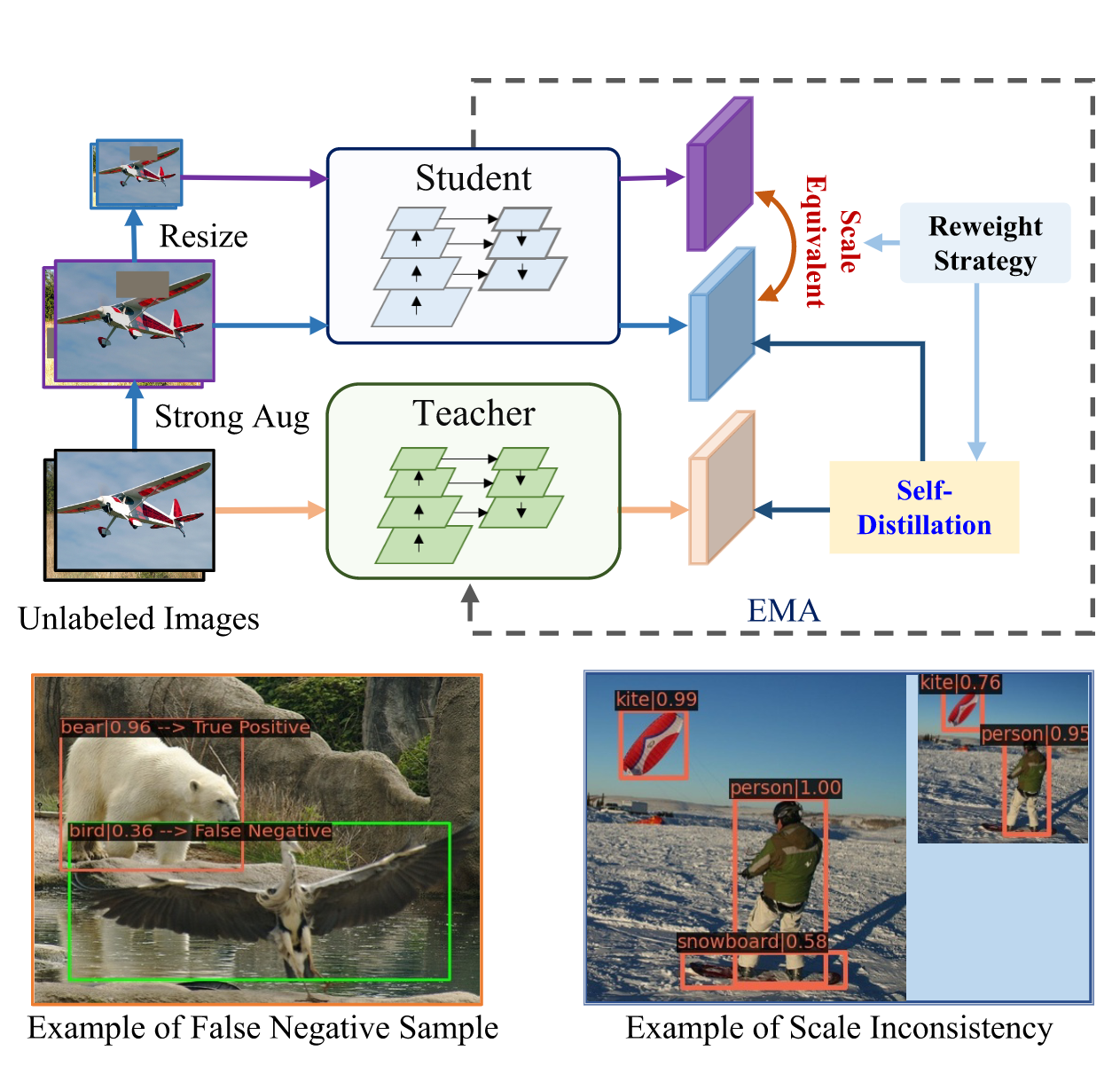 - 针对目前半监督目标检测任务中的困难,提出了Scale-Equivalent蒸馏框架,由以下几个部分组成: