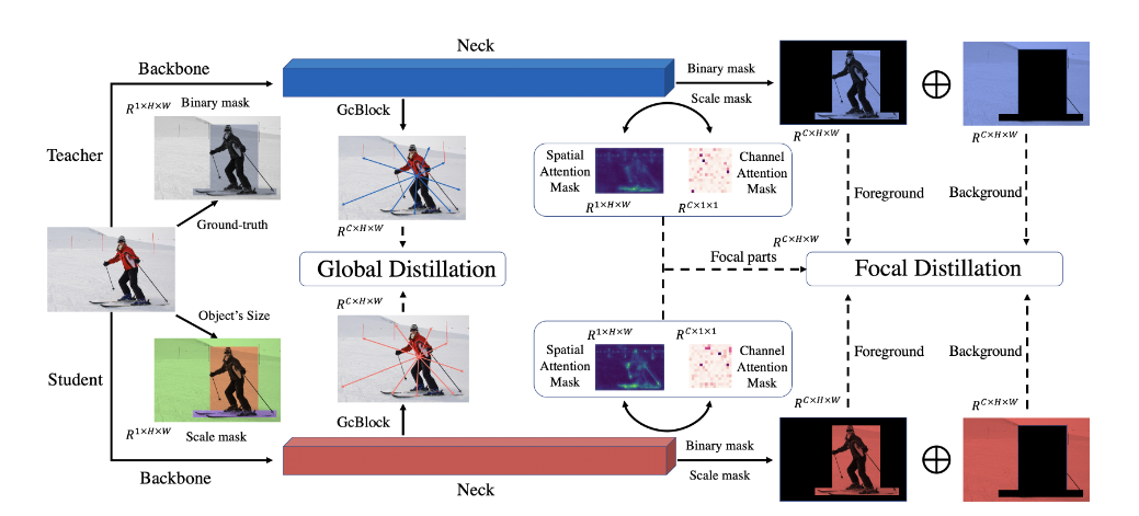 - 提出焦点和全局蒸馏,使学生不仅能够专注于教师关键的像素和通道,而且能够了解像素之间的关系。