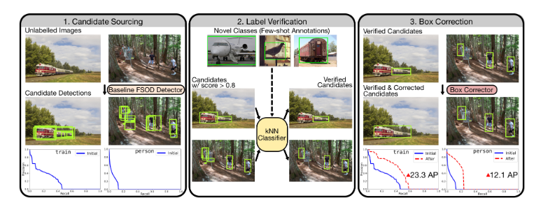 - 引入一种新的伪标注验证和修正算法,显著提高了伪标注的类别和标注框坐标的精度。首先用训练好的检测器对未标注的数据给出预测框,之后使用KNN对上一步的标签进行验证,再调整Faster RCNN的RPN以调整预测框的位置,从而得到大量高质量的预测框,将这些框作为训练数据继续训练检测器
