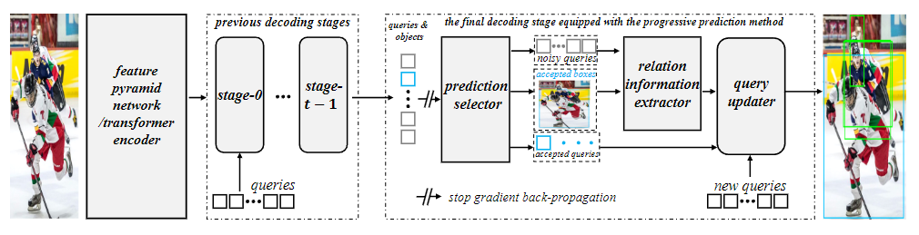 - 提出了一种渐进式预测方法,该方法使用预测选择器、关系信息提取器、查询更新器和标签分配器来提高基于查询的目标检测器在处理拥挤场景时的性能