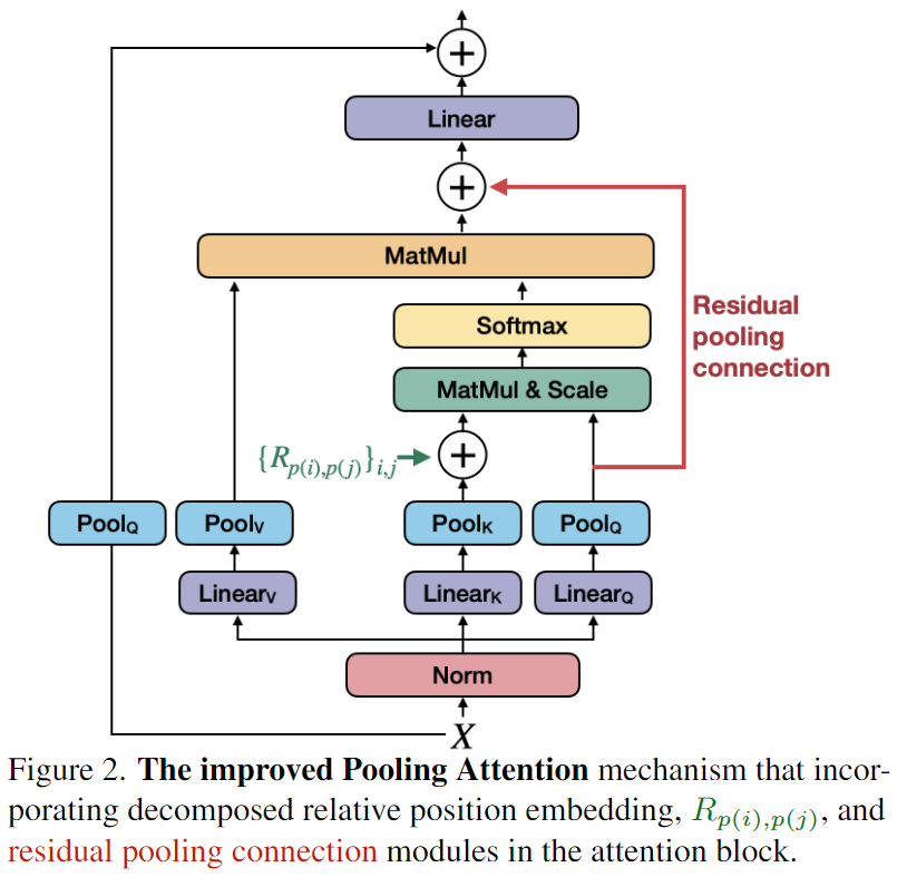- 优化了池化注意力机制: (a)移位不变的位置嵌入,即使用分解的位置距离引入transformer块的位置信息; (b)残差池化连接,以补偿注意力计算中的池化步长的影响。
