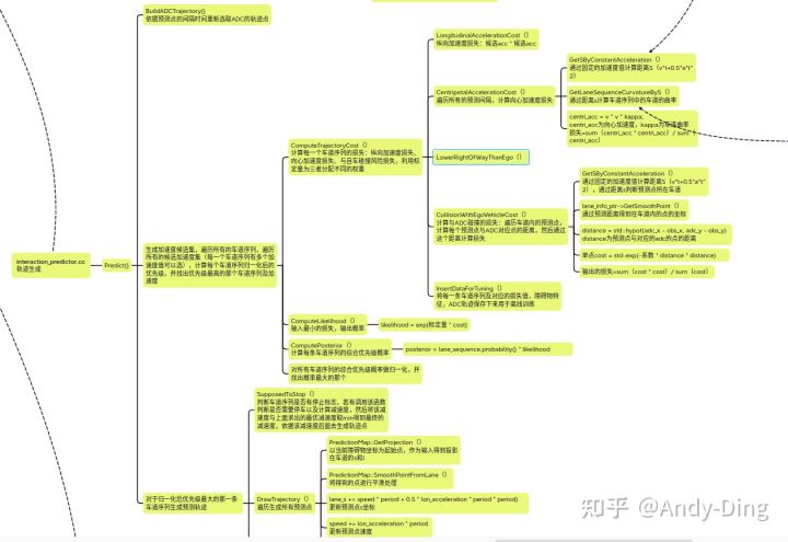 材料二:Apollo预测模块代码函数解读及调用关系(xmind形式,每种主颜色代表一个大的分支,对照预测模块的文件夹分布),包括预测模块所有cc文件