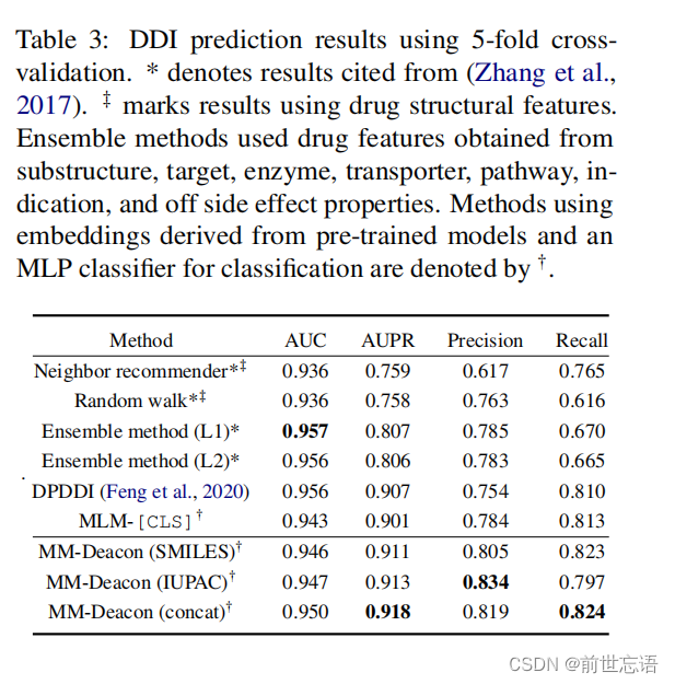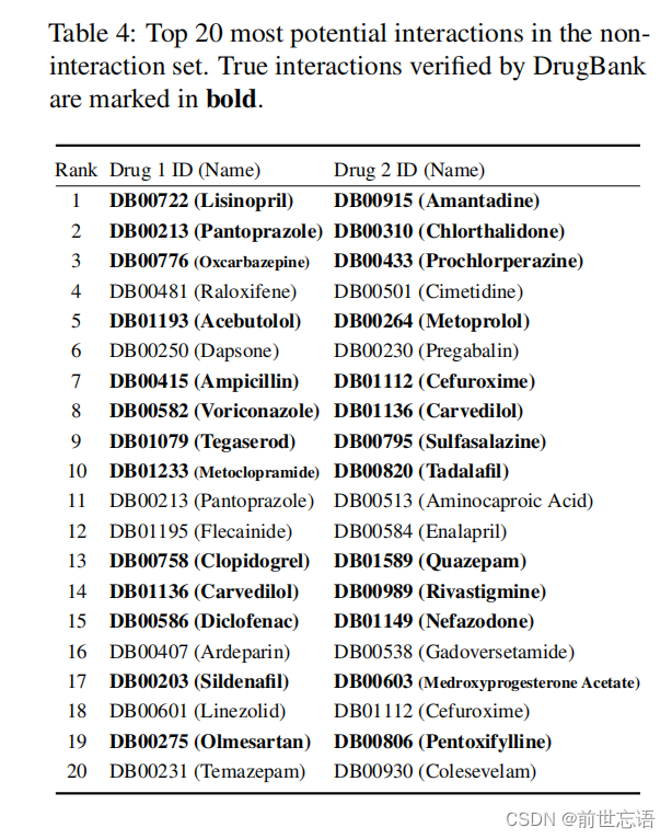 如表3所示,MM-Deacon在AUPR、Precision和Recall方面优于其他方法,当将SMILES和IUPAC指纹连接输入特征集时,可以获得最大AUPR。集成模型除了药物结构特性外,还包括额外的生物活性相关特征。表4显示了MM-Deacon(concat)预测的非交互集合(false positives)中的前20个最具潜力的交互作用,其中13个被DrugBank确认为true positives。而对于集成模型,这个值是7/20。