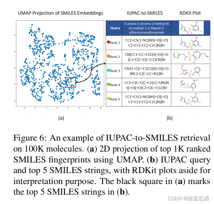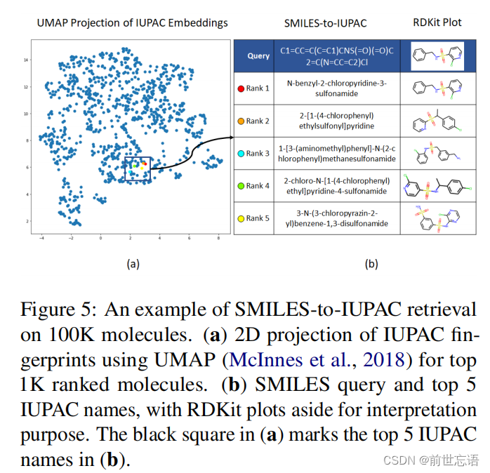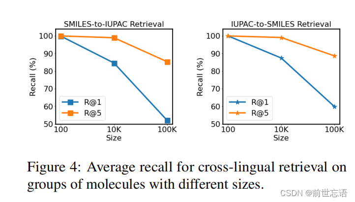 图4显示了SMILES-to-IUPAC和IUPAC-to-SMILES检索在召回率方面的结果。作者不仅直接对整个100K分子进行检索,还显示了对较小分子组(100,10K)的检索结果,以更全面地了解检索性能。MM-Deacon获得R@5两种类型的跨语言检索均超过85%,即使在对100K分子执行检索时也是如此。此外,图5和6分别显示了SMILES-to-IUPAC检索示例和IUPAC-to-SMILES检索示例。