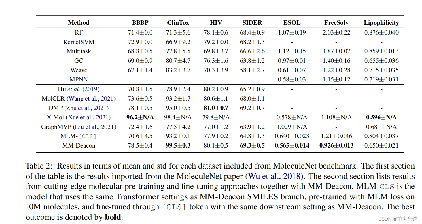 表2显示了每个数据集的平均值和标准差结果。表2的上半部分显示了从MoleculeNet导入的结果,而第二部分显示了MM-Deacon和其他最先进的分子预训练和微调方法的结果。MLM-[CLS]表示实现了Chemberta变体,该变体使用与MM-Deacon SMILES分支相同的Transformer设置,在10M分子上使用MLM损失进行预训练,并通过与MM-Deacon相同的下游设置通过[CLS]token进行微调。与其他基于训练前的方法相比,MM-Deacon在7个数据集中的4个中优于现有的最先进的方法,在其余3个数据集中具有可比性,在ClinTox和FreeSolv上有重大改进。