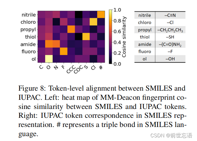 IUPAC语料库中的token和SMILES语料库的token之间的MM-Deacon指纹的余弦相似矩阵如图8所示。图8中的表格列出了用SMILES语言表示的IUPAC标记,热图表明SMILES和IUPAC之间存在良好的标记级对齐。