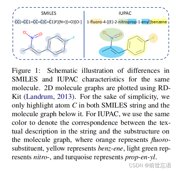 SMILES字符串是通过遍历分子图来创建的,其中SMILES字符串中的每个字母(如图1中的C, F, N, O)对应图上的一个原子,其他字符表示位置和连通性。然而,IUPAC名称类似于一种自然语言,IUPAC名称中的语素(如本例中的fluoro、prop、en、yl)通常代表分子图上特定类型的子结构,这些子结构也负责分子的特征化学反应。