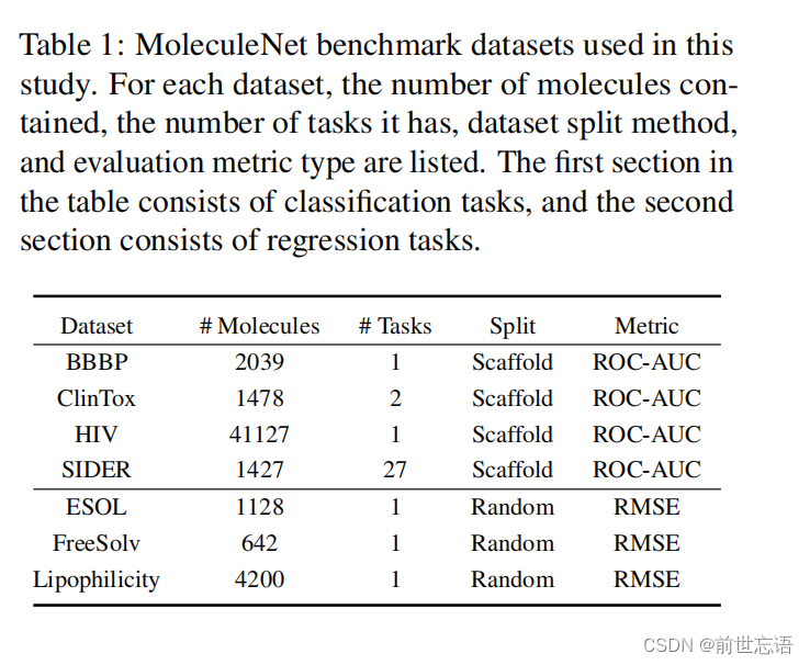 BBBP、ClinTox、HIV和SIDER数据集是分类任务,其中每个任务中都提供了分子SMILES及其二进制标签。使用ROC曲线面积AUC评估。对于具有SIDER等多个任务的数据集,报告同一数据集下所有任务的平均ROCAUC。每个分类任务的train/val/test的分数为0.8/0.1/0.1,使用Scaffold拆分。请注意,使用分子支架进行数据拆分会产生结构上更明显的train/val/test,这比随机拆分更具挑战性。ESOL、FreeSolv和Lipophilicity数据集的实验结果都是用于预测给定分子SMILES标签的回归任务。采用RMSE作为评价指标,其值越低表示性能越好。根据MoleculeNet的推荐,作者采用随机拆分,将每个数据集分为0.8/0.1/0.1,用于train/val/test。验证集上的结果用于选择最佳模型。为了保持与MoleculeNet的一致性,作者运行每个任务三次,每次使用不同的数据分割种子,以获得指标的平均值和标准偏差(std)。表1显示了每个数据集的详细信息,例如任务的数量和它所包含的分子。