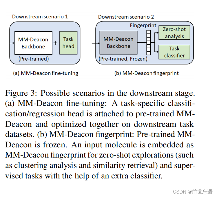 在预训练获得的知识可以以不同的方式转移到下游任务。图3列出了在下游阶段使用预训练MM-Deacon的两种情况。