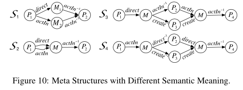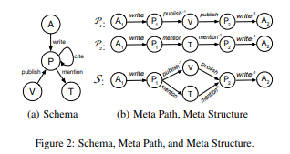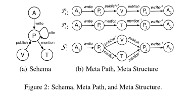元结构。我们提出了一个新的概念,称为元结构,来描述两个图形对象之间的关系。这本质上是一个对象和边类型的有向无环图。图2(b)说明了一个元结构S,它描述了如果两个作者在同一个地点发表了论文,并且也提到了同一个主题,那么他们是相关的。元路径(例如,P1或P2)是元结构的特殊情况。然而,一个元路径不能捕捉这样复杂的关系,而这种关系可以通过一个元结构方便地表达(例如,S)。我们的实验还表明元结构比元路径更有效。
