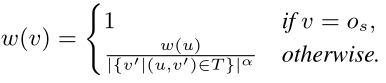 - w:将树节点v∈T映射到其权重w(v)的函数w(·)。权重是基于v的父u定义的,即(u,v) ∈ L,它考虑 (1) u的权重w(u),和 (2)u的#子,即|{v'|(u,v') ∈ T}|。具体来说,我们有