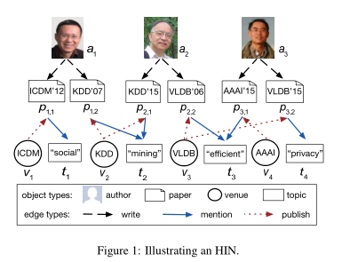图1说明了一个HIN,它也是一个参考书目网络。论文对象可以链接(或被链接)到其作者、地点及其相关主题。请注意,两个对象之间可能存在不同类型的多条边。