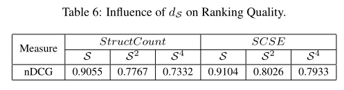 为了测试不同大小的有效性,我们使用了图6(b)中的元结构的连接,即S,S2和S4。直觉上,有了S,两个场地如果分享同一个作者,同一个话题,就是相关的。然而,对于S2和S4,相关性变得更加微妙,因为元结构涉及远程对象。当大小趋于无穷大(∞)时,top-k结果趋于全局结果。我们还比较了类似于第6.2.2节的排名质量(即nDCG)。如表6所示,元结构越大,排序结果越差。