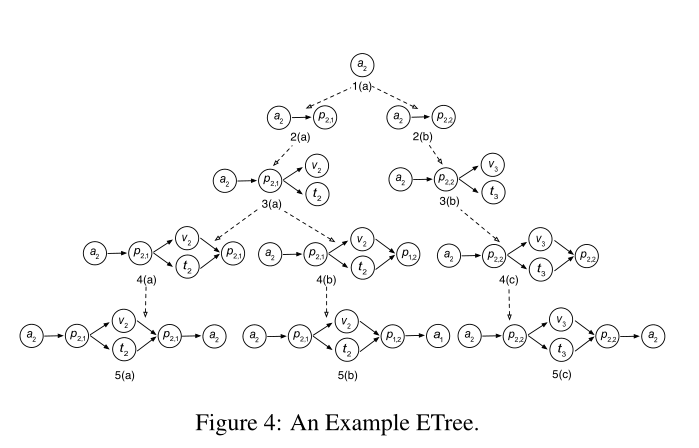 例如,假设我们基于图2(b)中的元结构遍历图4中的ETree。我们将图层设置为3,将g设置为3(b)中的图形。第一阶段,第四层只有一个元节点n,即n = P2,n依赖于两个节点,即V和t,然后我们可以看到g[V] = v3,它有两个邻居和