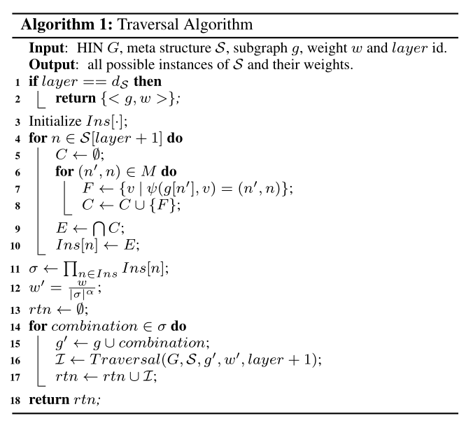 给定一个HIN G和一个元结构S,从一个源对象开始,我们可以在S层之后生成所有可能的实例s∈S。例如,给定一个HING(图1)和一个元结构S(图2(b)),从一个实例