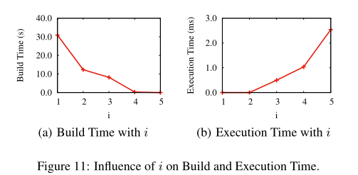 我们在图11(a)中显示了不同I值下离线构建I-LTable的时间。我们可以看到,随着I的增加,构建I-LTA table的时间减少。特别是,如果我们选择i =1 2dS= 3,我们需要10s来构建i-LTable。