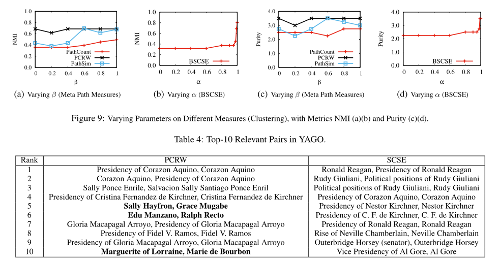 接下来,我们在表4中显示了PCRW和SCSE的前10个相关对(对于PCRW,我们使用具有最佳β的线性组合,获得最佳AUC值)。粗体的对是阴性样本。我们看到PCRW在前十对中有三个阴性样本。例如,莎莉·海弗伦和格雷斯·穆加贝出现在结果中的原因是他们已经嫁给了同一个人,并且由于元路径P1的权重支配着另一个(P2),所以这对夫妇有很高的分数,即使这两个人不满足P2。这解释了为什么基于元路径的度量比基于元结构的度量具有更低的AUC值。