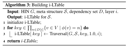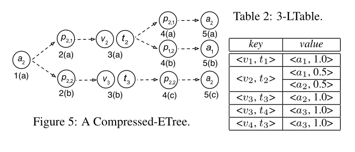 给定一个S,i-LTable w.r.t .第一层是一个数据结构,它将第一层的Compressed-ETree的每个节点实例v映射到最后一层的所有节点实例(以v为祖先)。具体来说,i-LTable的键是D[i]中存储的节点的实例,值是所有可能的目标对象的权重分布。给定图2(b)中的S,考虑图5中的压缩表,相应的3-表如表2所示。例如,当D[3] = {V,T},目标节点时,3-LTable的键是地点和主题对,值是作者权重的分布。