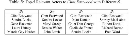 我们根据表5中前5名的结果进行了分析:(1)桑德拉·洛克在S1和S2的结果中排名很高,但在S3和S4的结果中相关性较低。这是因为S1和S2更短,他们倾向于找出直接与伊斯特伍德合作的演员,例如桑德拉·洛克。另一方面,S3和S4更长,所以他们倾向于寻找像马特·达蒙和雪莉·麦克莲恩这样的著名演员。(2)马特·达蒙在S3中排名很高,因为他与参加过伊斯特伍德执导的电影的演员和创作者进行了大量合作。(3)同样,雪莉·麦克莲恩在S4中名列前茅,因为他与伊斯特伍德参演过的电影的导演和创作者进行了大量合作。