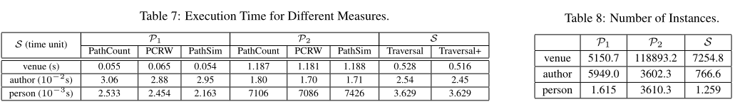 不同指标的AUC值如表3所示。观察到元结构的度量比元路径的度量更有效。这是因为S比单个元路径(即(P1or P2))更有表现力。在这里,S把结果限制在那些嫁给同一个人,隶属于同一组织的人,不能单独用P1或p2来表示。