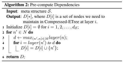 为了导出压缩的ETree,我们必须直观地预先计算和维护元结构每一层的必要节点,我们称之为依赖集。我们使用一个映射结构来存储需要在每一层维护的节点。细节如算法2所示。特别地,对于S中的每个节点n',我们首先得到该节点能够到达的最大层,即依赖于n'(步骤3)。然后我们将n'添加到相应的D层(步骤4-5)。在所有的节点都被添加到D之后,我们可以在D[i]中的i层得到我们需要维护的节点集。以图2(b)中的S为例;i = 1到5的依赖集D[i]分别为{A1}、{P1}、{V,T}、{P2}和{A2}。
