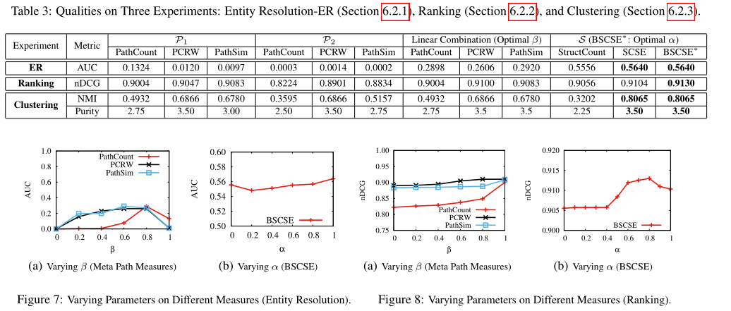 我们比较了三种应用中相关性度量的质量:实体解析(第6.2.1节)、排序(第6.2.2节)和聚类(第6.2.3节)。然后我们在第6.2.4节和第6.2.5节中研究了元结构的性质。