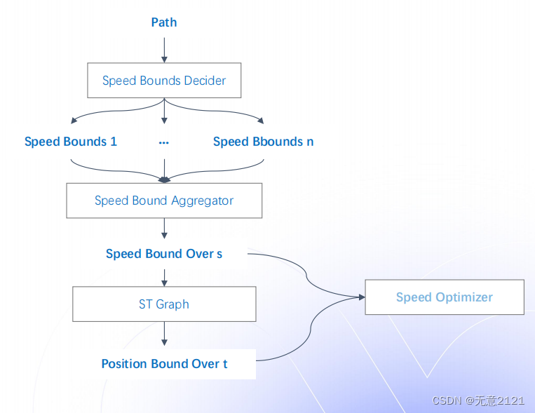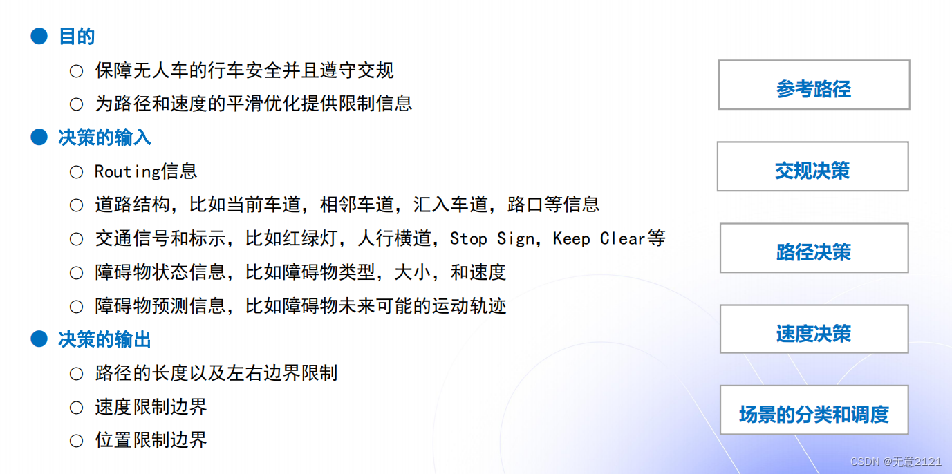 决策模块的上游有Routing、Prediction、Location、Perception等等module,这作为决策模块的输入。最终的输出则是路径、速度、位置的边界,为优化器提供条件