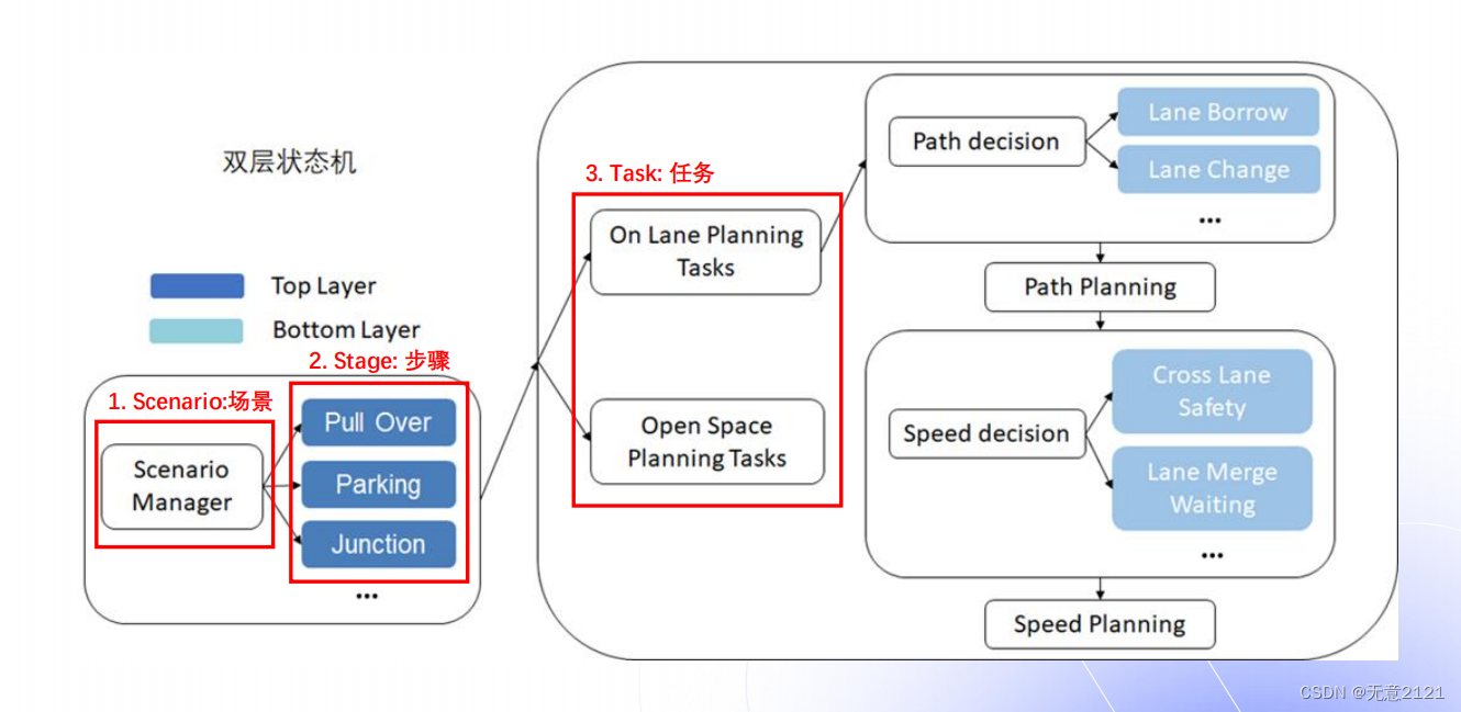 - 有限状态机不适用于比较复杂的自动驾驶车辆,于是Apollo选择用Top Layer+Bottom Layer的方式,将类似的状态集合到一个底层的状态机中,于是就形成了双层状态机