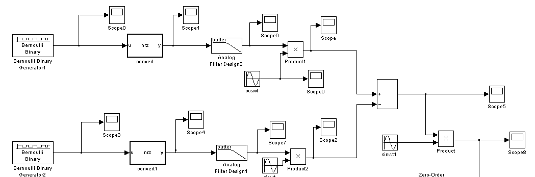 两路信号(I为上面一路,Q为下面一路)通过低通成形滤波器后与cos,sin相乘完成系统的调制,然后将两路调制信号相加完成混频,再发送出去。