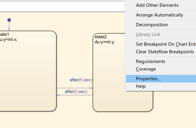 双击进入stateflow中,在空白处右键点击Properties进入进行相关设置,如Action Language是matlab语言可设置为C语言,更新方法等。