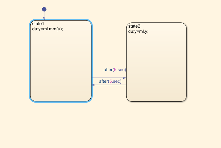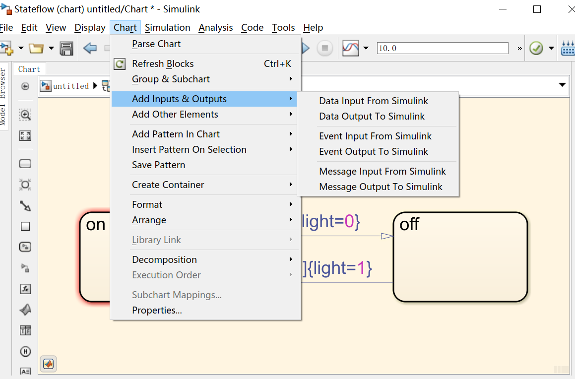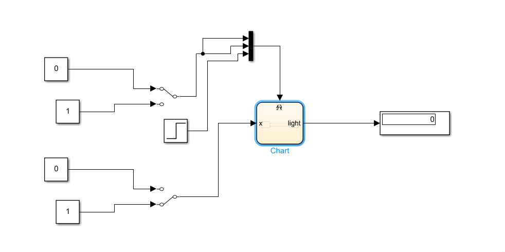 这里,通过ML即可获取工作空间的变量,搭一个stateflow如下: