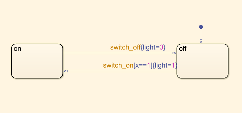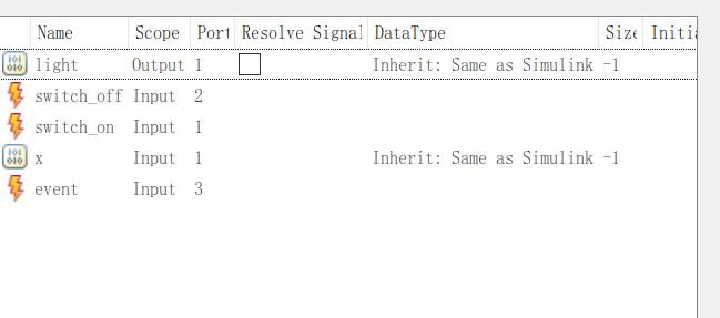 其实这个x==1条件可以看作家里总开关有电,switch_on表示控制灯的开关为开,light=1 表示灯亮。灯的变量设置如下:light为输出,switch_off为输入端口2,为下降沿,switch_on输入端口1,上升沿,x为输入,端口为1,event是为默认转移条件设置的,设置为输入3,设置为Either。是为了刚初始化时,状态为默认的off。
