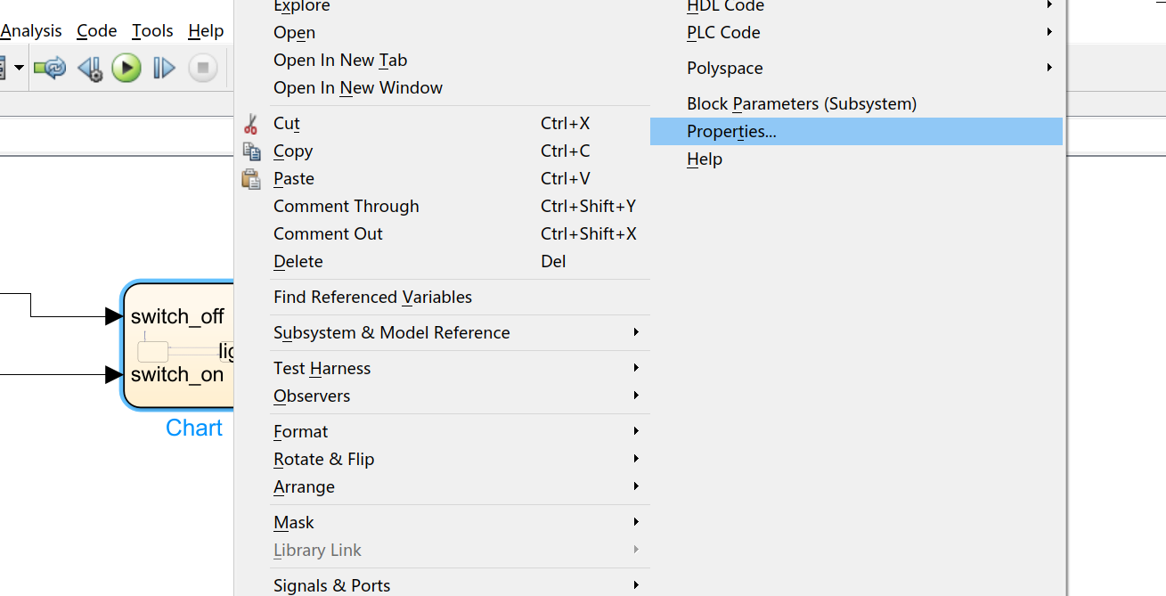 这样,点击OK,保存就好了,现在看调用函数的效果。回到工程,右击点击剪切stateflow模块,如下图:
