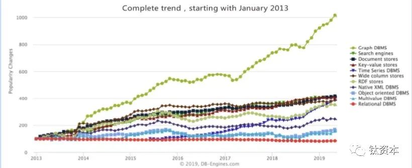 **第四是关于NoSQL的发展趋势,根据DB Engines第三方的统计,图数据库是发展最快的,搜索数据库紧随其后,第三是文档数据库,第四是健值数据库。**在图数据库领域有两家明星公司——硅谷的Tigergraph和Neo4j,Tigergraph上一轮估值三亿美金,由百度华创投资;还有就是文档数据库,代表性公司MongD已经是上市公司,估值92亿美金,收入2.6亿,可以看到在这个领域存在能够实现国产替代的机会。