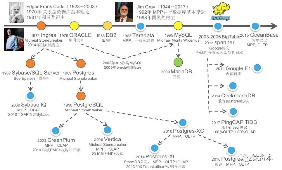 谈及数据库的发展历史,就不得不提及三位数据库领域的开拓者,分别是Frank、Micheal和Jim Gray,他们为数据库理论奠定了坚实的基础,都获得了图灵奖。早在1972年,Micheal最早提出了Ingres数据库,于2014年获得图灵奖,Ingres数据库最后分化衍生为Sybase与Postgres两部分。其中Postgres数据库有大量分析函数,适用于分析型事务,尤其是OLAP。1972年,埃里森在硅谷开发了Oracle数据库,再到1983年IBM开发了DB2数据库,同年Tdata诞生,直到1995年MySQL数据库诞生。而如今的Oracle于2009年收购了MySQL,这样一来就同时拥有了Oracle和开源的MySQL两套数据库,MySQL的创始人在离开后又开发了一套数据库MariaDB,现在国内有很多银行,像亿联银行等新的银行都在使用MariaDB。