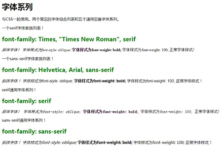 <p>与CSS一起使用。两个常见的字体组合列表和五个通用后备字体系列。</p>