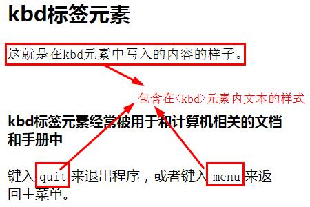 <kbd>元素是用于表示用户输入,键盘输入,语音命令等,它经常被用于和计算机相关的文档和手册中。被包含在<kbd> ..... </ kbd>标签内的文本通常是以浏览器的默认等宽字体显示。下面我们来看看示例: