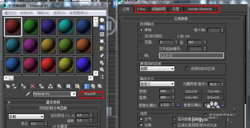 8、启动max后,我们打开材质编辑器和渲染设置面板,这时候会看到一个各种颜色的材质球,那就是vray的默认材质显示,在渲染器设置上也是将指定渲染器改为了vray渲染器。