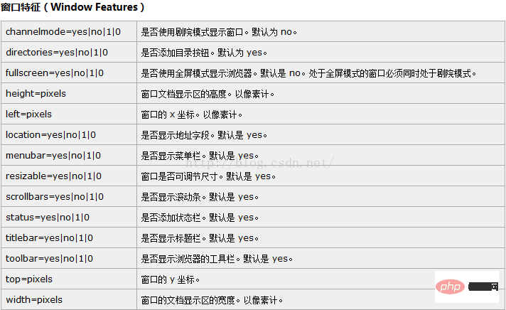 它接收4个参数:要加载的URL,窗口名称,特性字符串和一个布尔值。以下从window.open的参数设置和返回值两部分来介绍