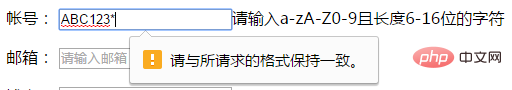<input type="text" name="username" autocomplete="on" required="required" pattern="^[0-9a-zA-Z]{6,16}$" />请输入a-zA-Z0-9且长度6-16位的字符 </p>