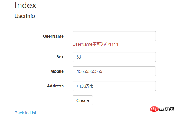 1 public class UserInfo2 {3 [Required(ErrorMessage = "UserName不可为空1111")]4 public string UserName { get; set; }5 public string Sex { get; set; }6 public string Mobile { get; set; }7 public string Address { get; set; }8 }登录后复制前端: