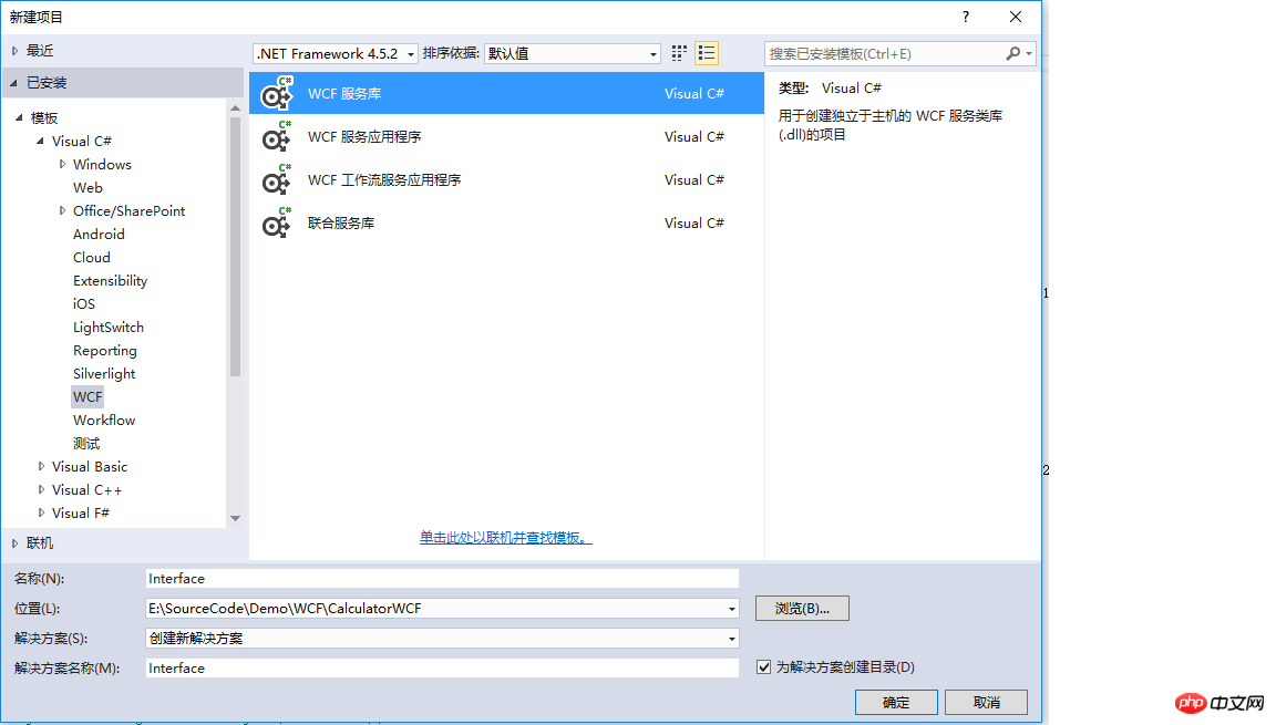 }登录后复制2、新建服务契约,其实就是实现契约的类 ,添加"新建项目"->WCF->"WCF服务库" (如 第一步新建契约是一样的步骤),类库的名称为Service,