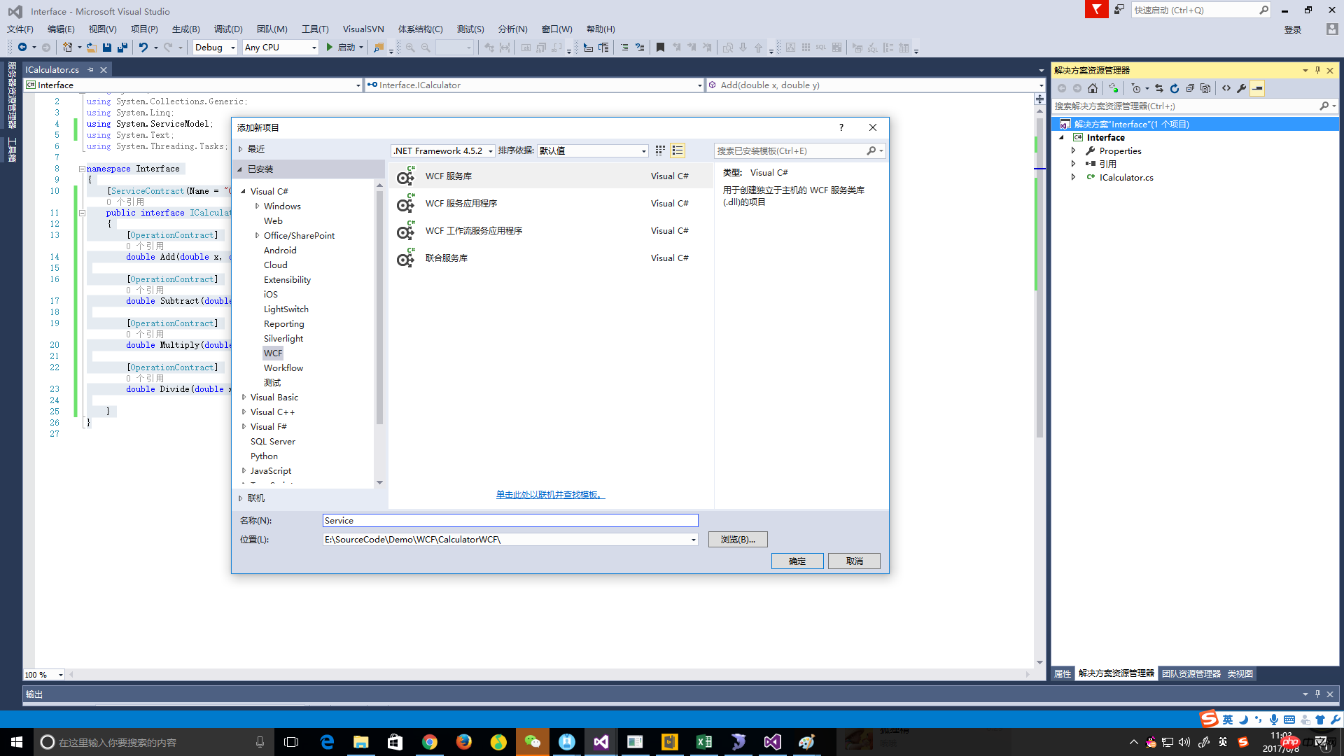 契约是对外开放的接口,暴露给客户端的函数名称首先,新建一个wcf服务库,名称为Interface,如图所示: