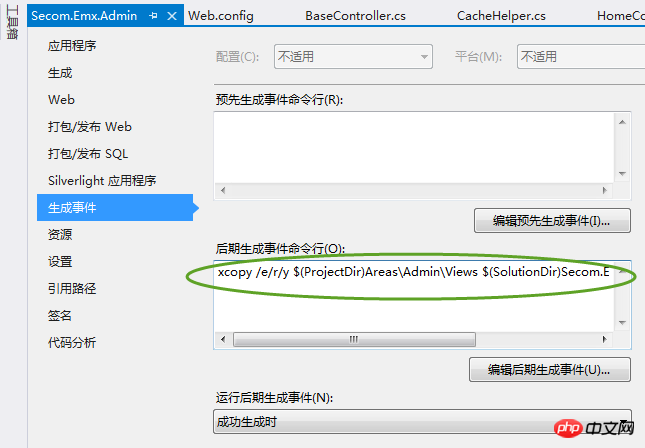 右键单击项目Secom.Emx.Admin,选择“属性”——“生成事件”添加如下代码:
