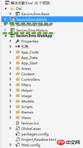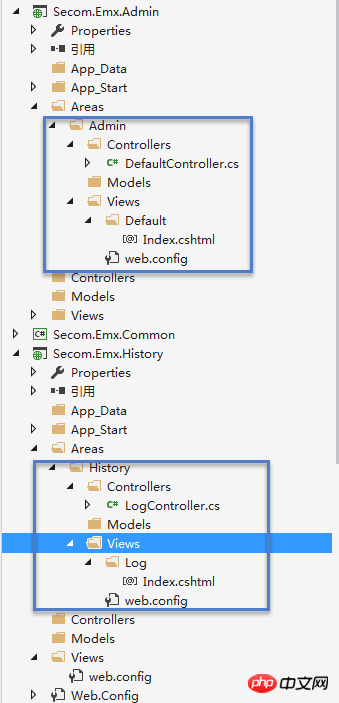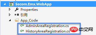 区域配置文件我放置到了Secom.Emx.WebApp中,其实你完全可以独立放置到一个类库项目中,因为注册区域路由的后,项目最终会寻找bin目录下面所有继承了AreaRegistration类的,然后让WebApp引用这个类库项目,Secom.Emx.WebApp项目添加Secom.Emx.Admin、Secom.Emx.History的引用。