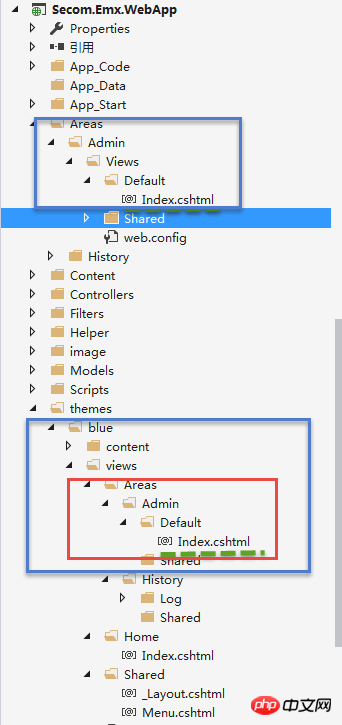 你会发现Secom.Emx.Admin模型下面的Areas目录和Secom.Emx.WebApp中的目录是一模一样的,其实我最初不想在模块项目中添加任何的View,但是为了方便独立部署还是加了。
