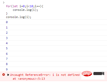 console.log(i);}console.log(i); //报错,i is not defined.登录后复制如下图: