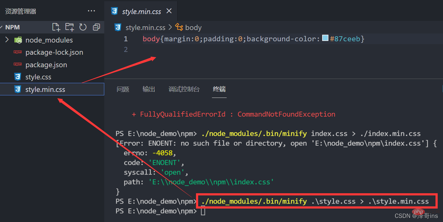 那么出现报错的原因是:因为我们把全局改成了当前项目下(局部安装),所以我们要想使用该压缩命令,需要找到minify这个包。
