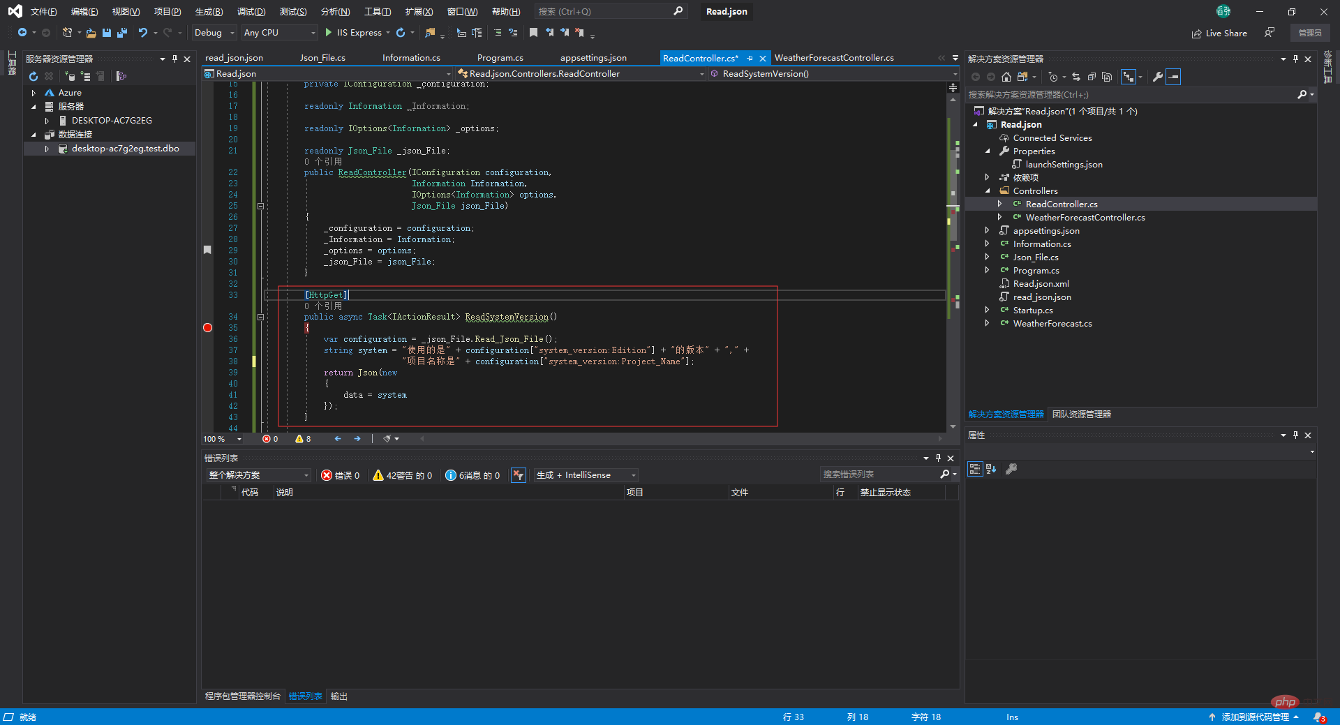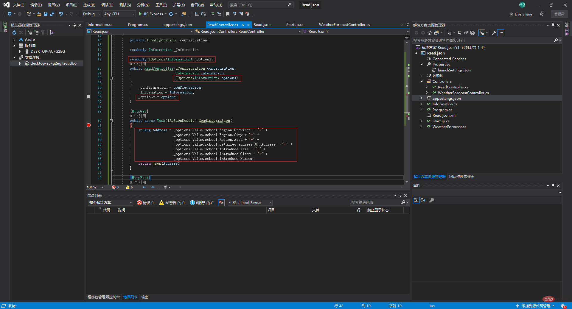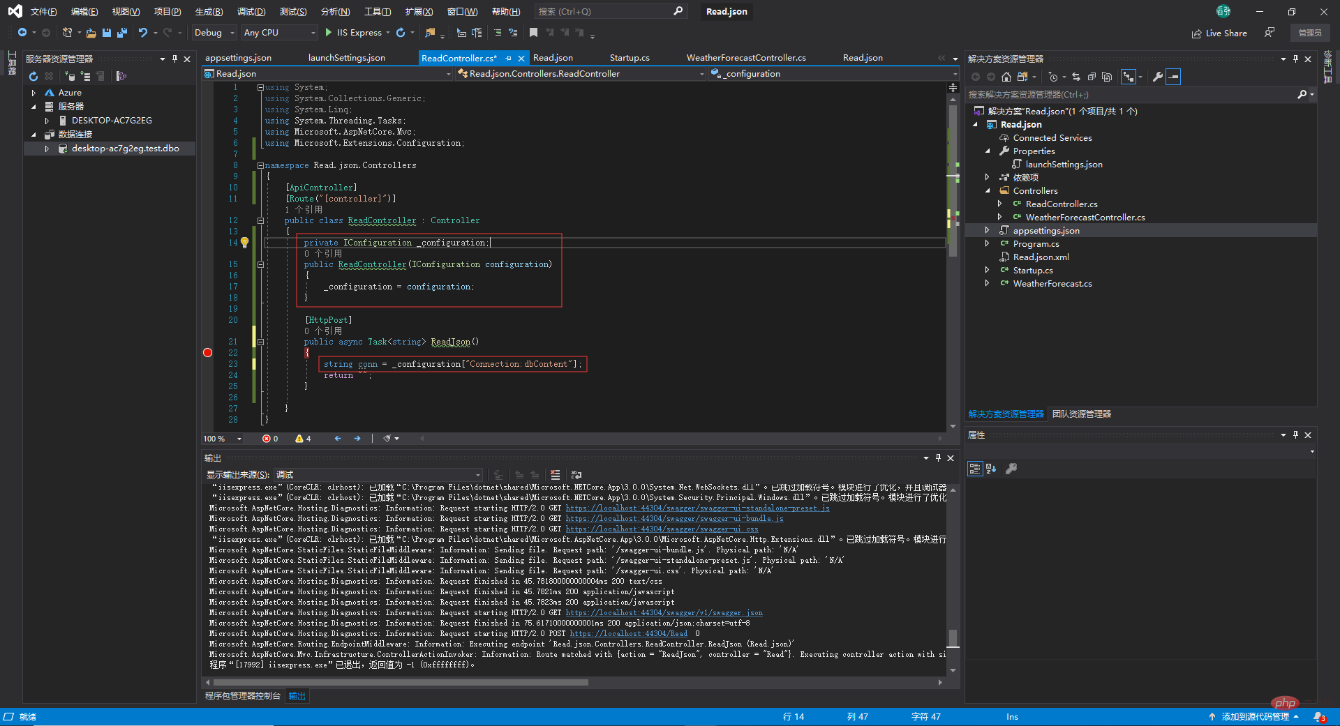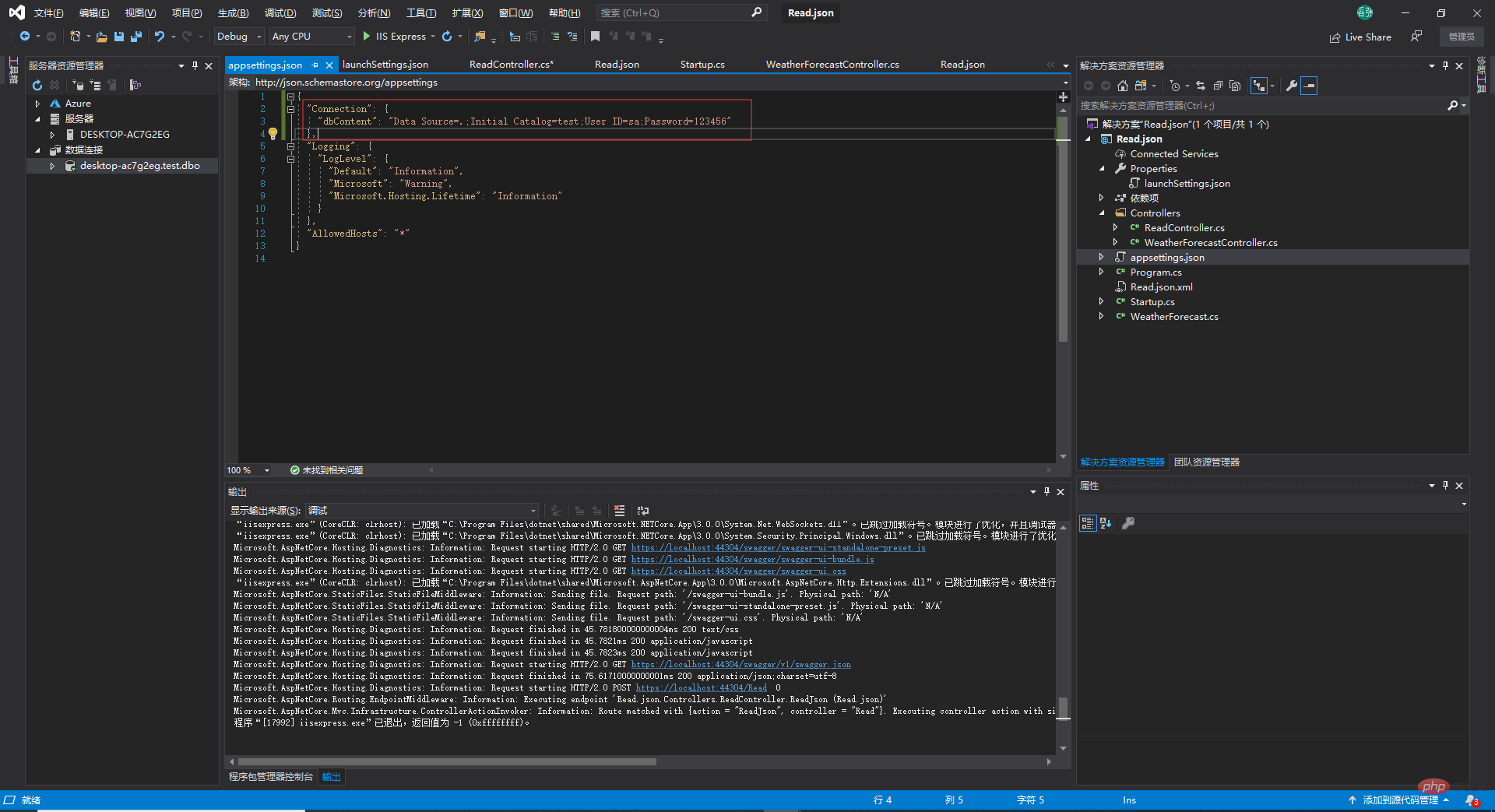 我们先在appsettings.json中配置好数据库连接字符串,然后读取它